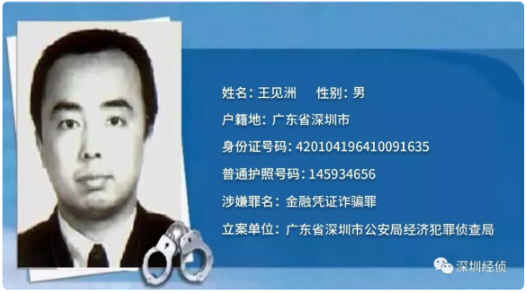 犯罪嫌疑人姓名:王見洲,男,1964年10月9日生,漢族,籍貫湖北省武漢市,戶籍地廣東省深圳市,身份證號碼:420104196410091635,普通護照號碼:145934656,原中國工商銀行深圳分行紅圍支行泥崗辦事處副主任。因涉嫌金融憑證詐騙罪于1998年12月潛逃出境。國際刑警組織于2016年11月14日對王見洲發(fā)布紅色通報。