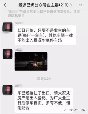 有業(yè)主介紹,今天凌晨3點(diǎn)左右,這輛寶馬車的車主曾在業(yè)主群里留言,稱他的車已經(jīng)擋住了出口,需要業(yè)主憑房產(chǎn)證才能從此經(jīng)過。
