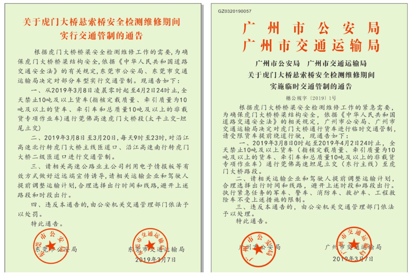 從2019年3月8日至2019年3月20日,每天9:00-23:00,對(duì)沿江高速北行轉(zhuǎn)虎門(mén)大橋主線匝道口、沿江高速南行轉(zhuǎn)虎門(mén)大橋二級(jí)匝道口進(jìn)行交通管制。