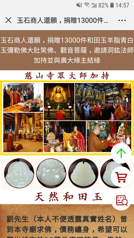 記者打開(kāi)警方提供的網(wǎng)站鏈接,隨即便出現(xiàn)了香港某知名寺院的頁(yè)面,上面有不同的法師主持不同法事的照片。照片上方,赫然寫著"玉石商人還愿,捐贈(zèng)13000件和田玉羊脂青白玉彌勒佛大肚笑佛、觀音菩薩,邀請(qǐng) XX法師加持并與廣大緣主結(jié)緣"的字樣。接下來(lái)網(wǎng)頁(yè)上便講述了一個(gè)漏洞百出、文理不通的"傳奇故事"——