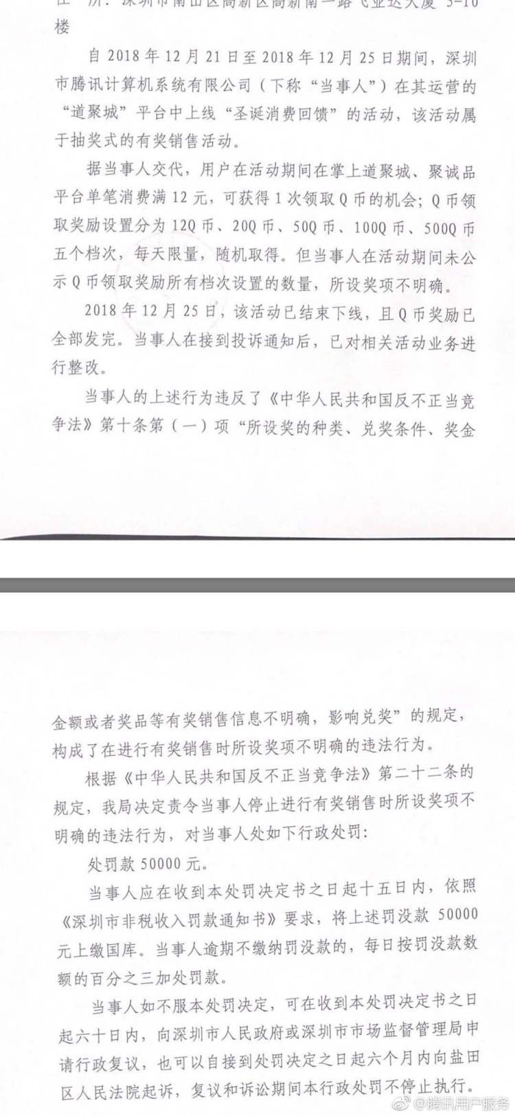 為解答網(wǎng)友疑惑,當(dāng)天晚間,微博賬號騰訊用戶服務(wù)公開發(fā)布了該處罰決定書,決定書中提到,2018年12月21日 -25日期間,深圳市騰訊計(jì)算機(jī)系統(tǒng)有限公司(下稱"當(dāng)事人")在其運(yùn)營的"道聚城"平臺(tái)中上線"圣誕消費(fèi)回饋"的活動(dòng),該活動(dòng)屬于抽獎(jiǎng)式的有獎(jiǎng)銷售活動(dòng)。