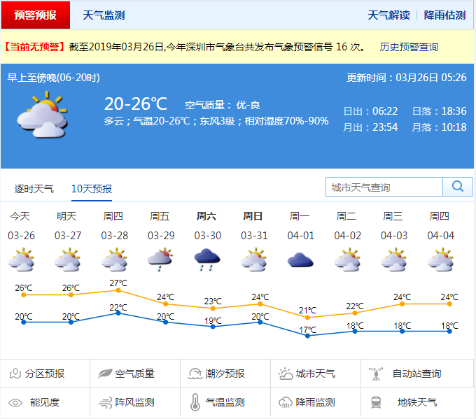 深圳新聞網(wǎng)2019年3月26日訊 今日深圳天氣多云,氣溫18-25℃,偏東風(fēng)3級,相對濕度70%-95%。預(yù)計(jì)27-28日可見陽光,早晚有輕霧,氣溫逐日回升;29-31日冷空氣影響,深圳市轉(zhuǎn)陣雨或雷陣雨,氣溫下降,天氣轉(zhuǎn)涼。