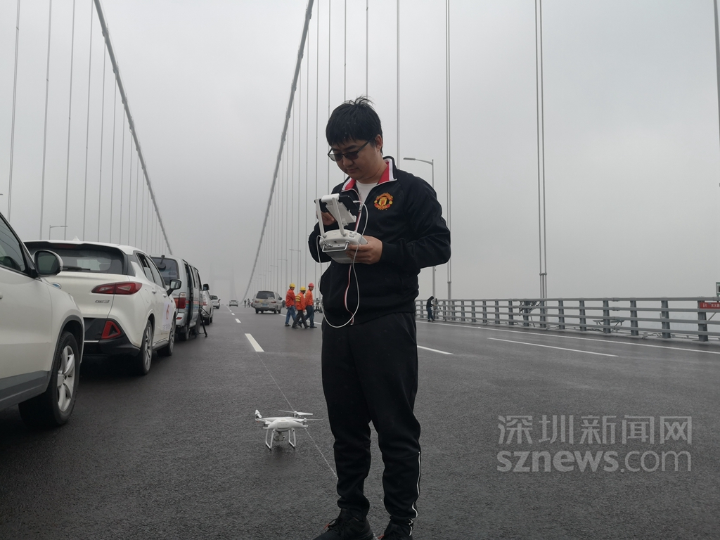 深圳新聞網(wǎng)記者齊釗遠(yuǎn)在橋面上調(diào)試無(wú)人機(jī),準(zhǔn)備航拍虎門二橋(現(xiàn)名南沙大橋)