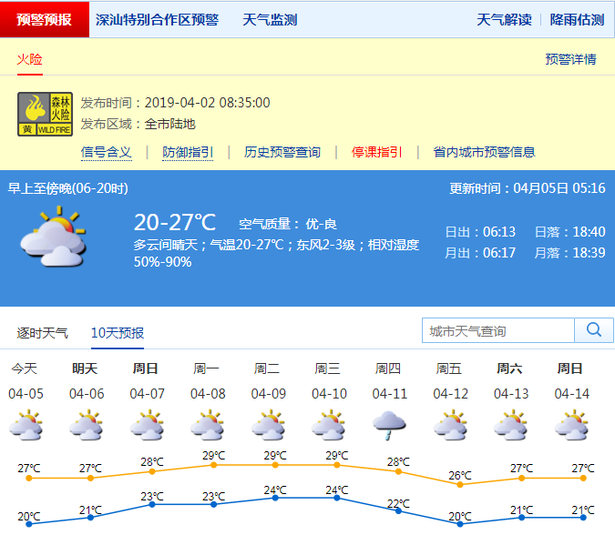 深圳新聞網(wǎng)2019年4月5日訊 深圳市氣象臺(tái)預(yù)計(jì),清明假期(5-7日)我市多云可見陽(yáng)光,溫暖干燥。其中,5日氣溫20℃-27℃,相對(duì)濕度50%-90%,東風(fēng)2-3級(jí);6-7日多云可見陽(yáng)光;8-10日以多云為主,氣溫繼續(xù)上升,偶有分散陣雨。