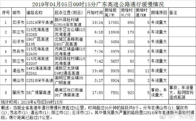 廣東交警部門此前預(yù)計(jì),從4月4日至7日全省高速公路車流都將持續(xù)處于高位,出行最高峰出現(xiàn)在4月4日15時(shí)至5日凌晨2時(shí)。4月5日9時(shí)15分,廣東高速車通行緩慢長度超過5公里,時(shí)間超過30分鐘的路段共8個(gè)。