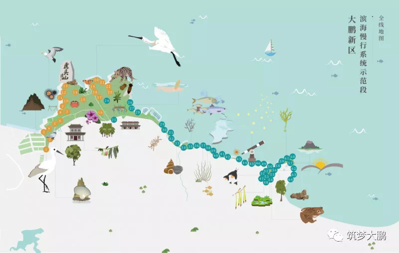 大鵬新區(qū)根據(jù)線路的地形、山海景觀、人文景觀的分布,確定了“打造‘兩線、三段、五大節(jié)點’的濱海生態(tài)自然課堂步道”。據(jù)新區(qū)建筑工務(wù)局負責人介紹,從新大河入海口到大亞灣海岸鹿咀懸崖,全長18.7公里的海岸線上分布著河流、山林、海灘、溪流、濕地等多樣生態(tài)系統(tǒng)。2017年7月,大鵬新區(qū)按照濱海慢行系統(tǒng)示范工程標準,動工建設(shè)新大-鹿嘴市政綠道?!皟删€”指的是沿著海岸的濱海徒步路線和城市二號綠道線,兩條線之間的6.6平方公里土地將形成一座開放的郊野公園;“三段”分別為活力生活段、自然生態(tài)段和休閑旅游段;“五大節(jié)點”為山海綠畔、古廟遺風(fēng)、東山凹、愛情灘、鹿咀山莊等自然景觀。