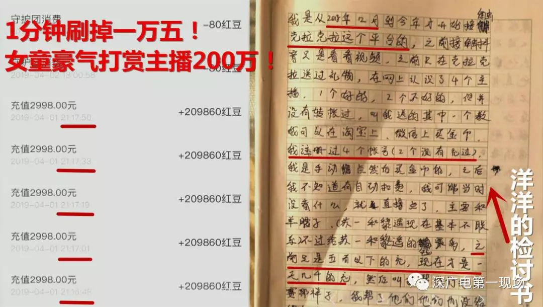 深廣電第一現(xiàn)場(chǎng)2019年4月12日訊 這兩天《第一現(xiàn)場(chǎng)》報(bào)道了11歲女童洋洋打賞某直播平臺(tái)主播近200萬(wàn)!家長(zhǎng)要求她寫(xiě)了一份檢討書(shū)……