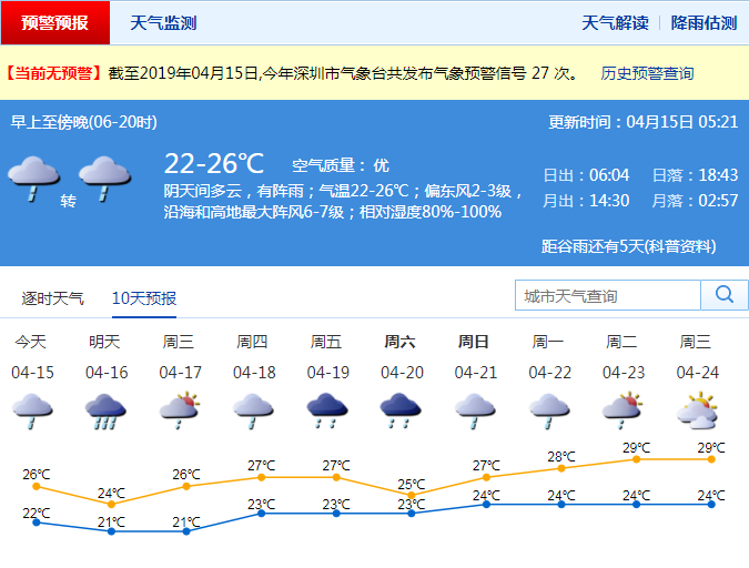 深圳新聞網(wǎng)2019年4月15日訊 記者從市氣象局了解到,15日我市有陣雨或雷陣雨,16日白天有大雨到暴雨,并伴有短時大風(fēng)、雷暴和短時強降水。提醒市民,強降水時請注意遠離河道、低洼處等危險區(qū)域。