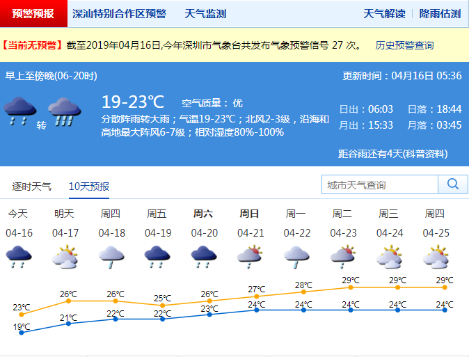 市氣象局預(yù)計(jì)17日降雨減弱,陣雨轉(zhuǎn)多云;18-20日,天氣仍不穩(wěn)定,多雷雨。21-22日,降雨趨于減弱。深圳市氣象臺(tái)2019-04-1605:36:00發(fā)布。