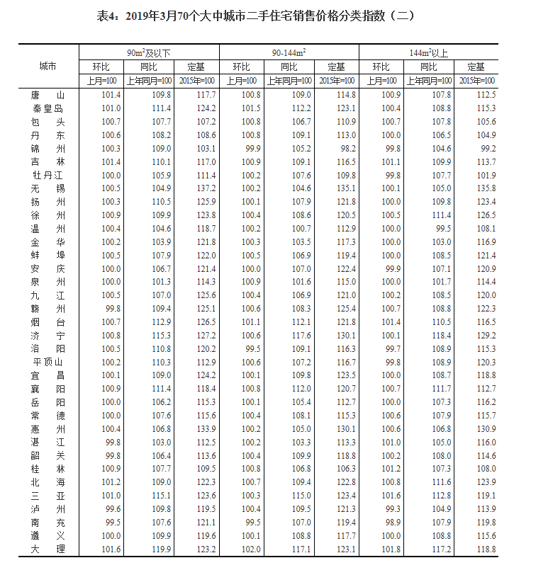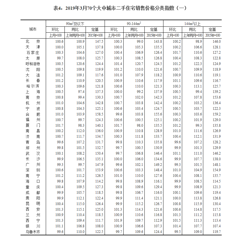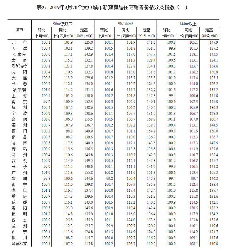 2019年3月份70個大中城市商品住宅銷售價格變動情況