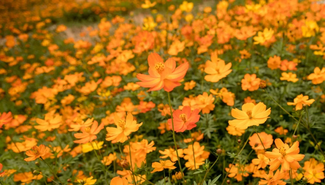 幾十上百朵小花爭(zhēng)相聚集,宛如一個(gè)半球形的紅橙色團(tuán)子,植被高低錯(cuò)落,說一句花團(tuán)錦簇,倒也貼切。