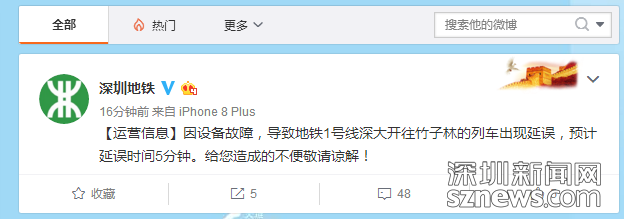這周的星期一,深圳地鐵1號(hào)線深大開(kāi)往竹子林列車(chē)延誤