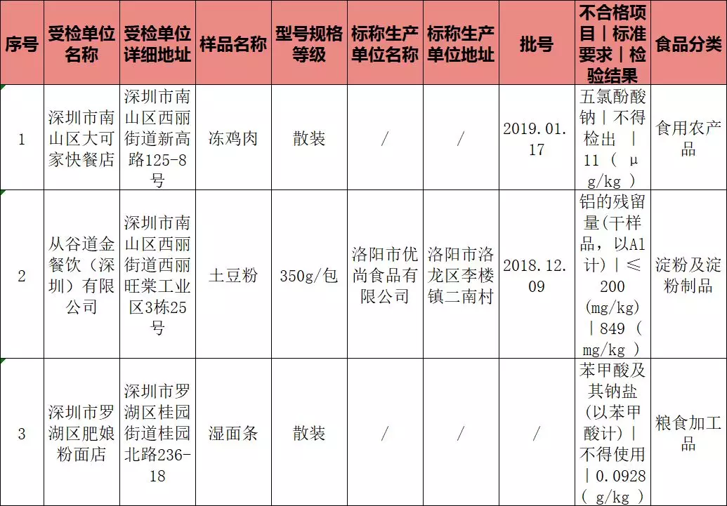 淀粉制品不合格樣品為土豆粉,不合格受檢單位是南山區(qū)西麗街道的從谷道金餐飲(深圳)有限公司,不合格項(xiàng)目為鋁的殘留量超標(biāo)。