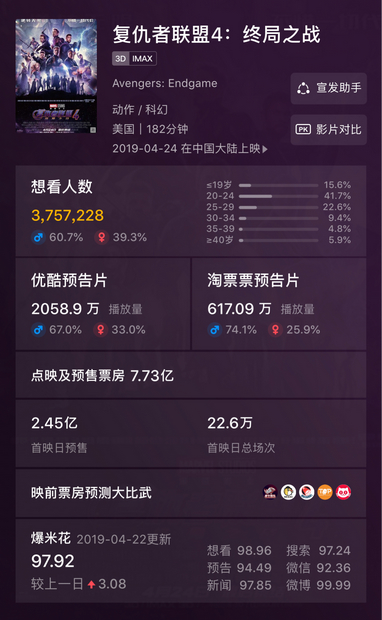 值得注意的是,淘票票×優(yōu)酷雙端合并平臺(tái)的“想看+預(yù)約”數(shù)超500萬(wàn),雙端預(yù)告片播放量破2600萬(wàn),打破進(jìn)口片想看+預(yù)約”紀(jì)錄,成為全網(wǎng)第一。淘票票打造的“漫威社區(qū)”突破450萬(wàn)訪問(wèn),“想看人數(shù)”達(dá)到370萬(wàn)(如圖),想看、評(píng)分和評(píng)論都是平臺(tái)沉淀下的重要數(shù)據(jù),它代表著用戶粘性和平臺(tái)依賴度。