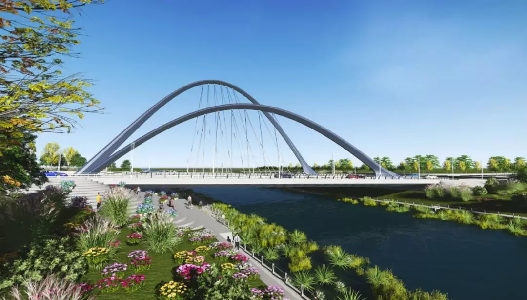 11號(hào)景觀橋以“融合”為主題,將流暢的線條融入景觀橋梁中,兩幅高低拱的線條無(wú)限延伸,猶如行云流水般瀟灑寫意,一氣呵成;同時(shí),匯聚為一體的主拱又形成了“門”的形象符號(hào),迎接著八方來(lái)客。