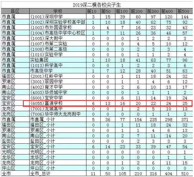 總分前十名中,深圳富源學(xué)校占了六人。前五十名,富源學(xué)校占了十三人,總分前一百名占了十六人??墒强偡智拔灏倜?,富源學(xué)校占到的數(shù)量卻沒有超過30人。