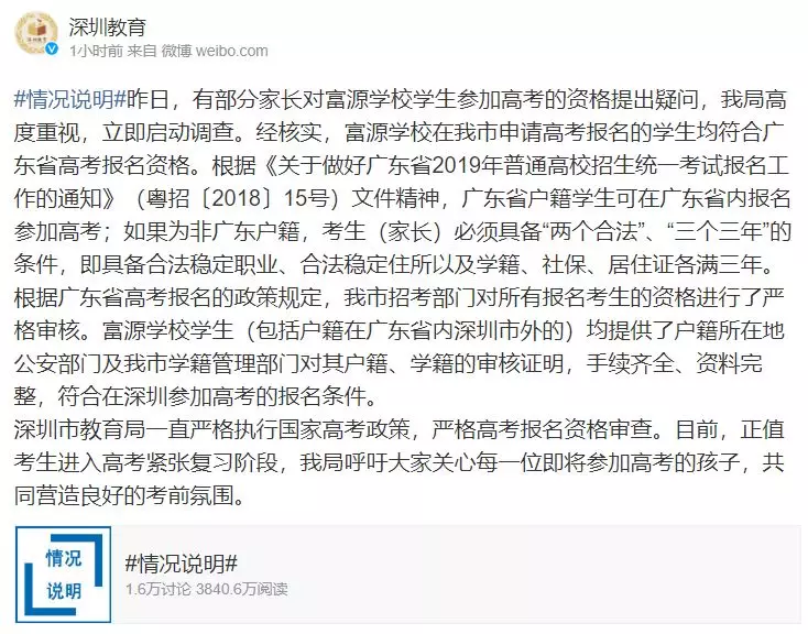 該回應稱:經核實,富源學校學生均提供了戶籍所在地公安部門及我市學籍管理部門對其戶籍、學籍的審核證明,手續(xù)齊全、資料完整,符合在深圳參加高考的報名條件。