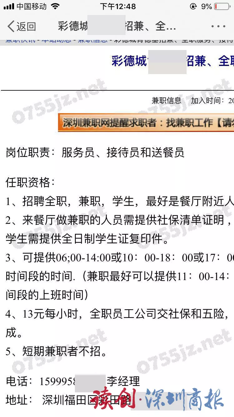 4月8日晚間,江女士在微博搜索“撿手機(jī)者”電話號(hào)碼,在深圳某知名連鎖餐廳發(fā)布的招聘信息中,無(wú)意中發(fā)現(xiàn)其的聯(lián)系電話。