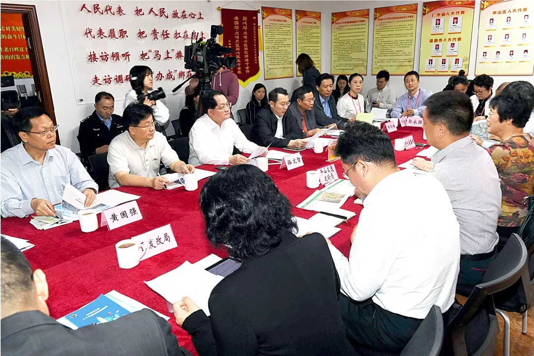 5月8日,南山街道月亮灣片區(qū)人大代表社區(qū)聯(lián)絡(luò)站召開代表議事會。深圳市人大常委會主任駱文智、南山區(qū)委書記王強、區(qū)人大常委會主任麥林光,與駐站市、區(qū)人大代表,居民代表圍繞“完善地鐵站點與地面交通接駁,緩解月亮灣片區(qū)居民出行難”主題進行熱烈討論。
