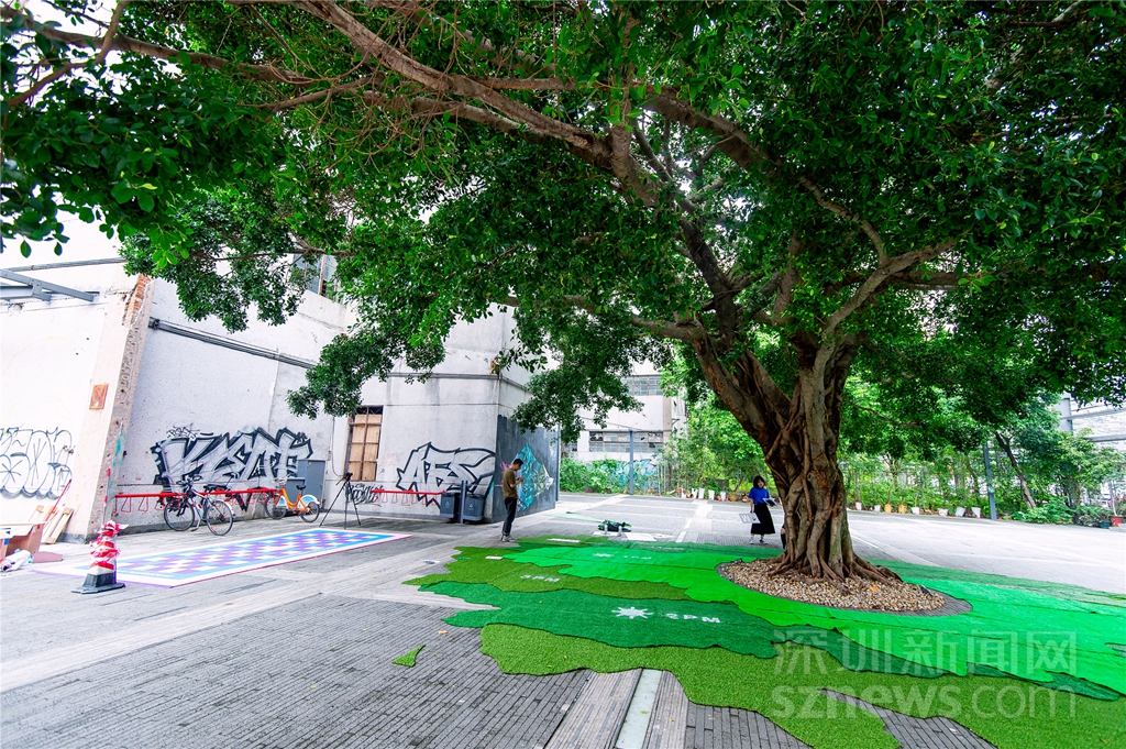 作品《朝九晚五》,用不同深淺的綠色地毯,勾勒出不同時段太陽投下的樹蔭的形狀