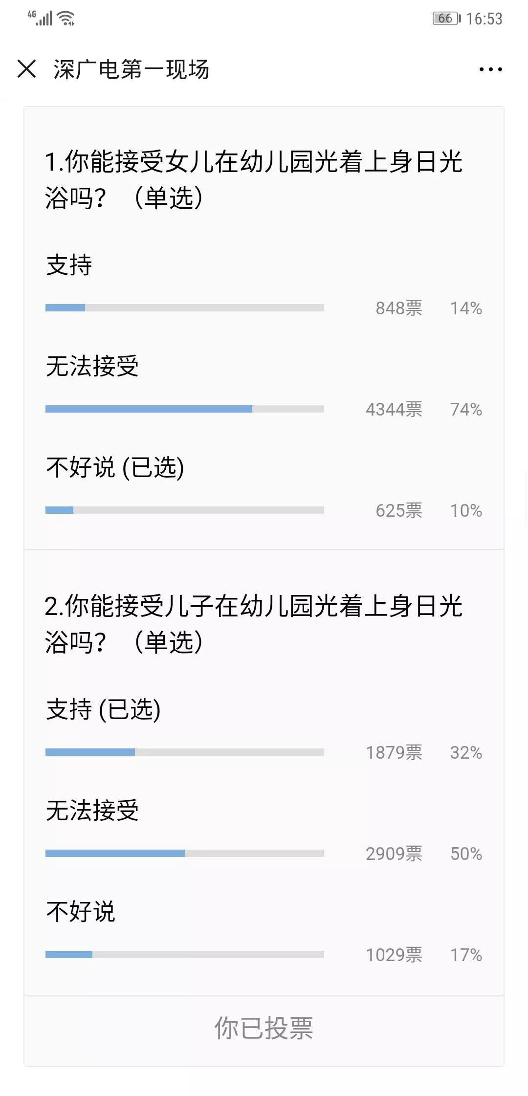 節(jié)目播出后,在第一現(xiàn)場(chǎng)微信公眾號(hào)上進(jìn)行的話題投票中,有74%的觀眾都認(rèn)為無法接受女兒在幼兒園光著上身日光浴,另外有50%的人認(rèn)為無法接受兒子進(jìn)行同樣的行為。
