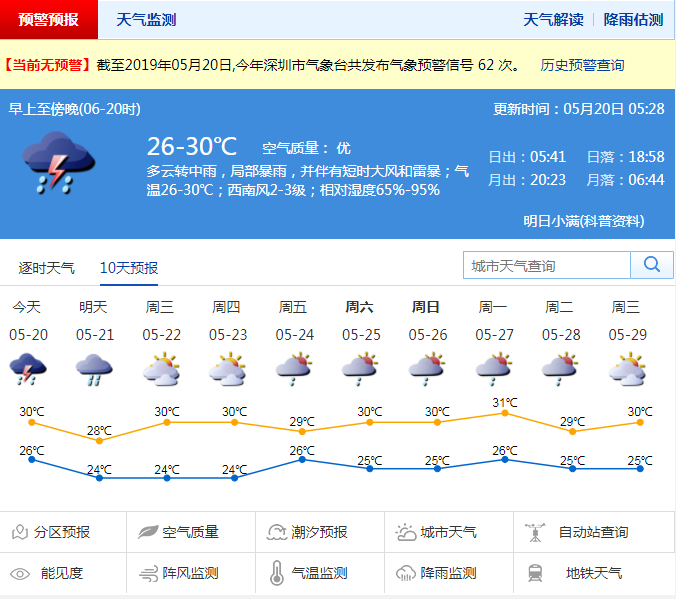 一年一度的“5·20”又來了,深圳近年來5月20日當(dāng)天局部暴雨以上的降雨的風(fēng)險較高。果然,受冷空氣影響,今天白天全市有降雨,局部地區(qū)降雨量級可達到大雨到暴雨,并伴有雷暴和8級左右短時大風(fēng),天氣較劇烈,雷雨過程恰逢周一上班,市民注意合理安排出行。氣溫在25℃-29℃,高溫暴曬天氣緩解。