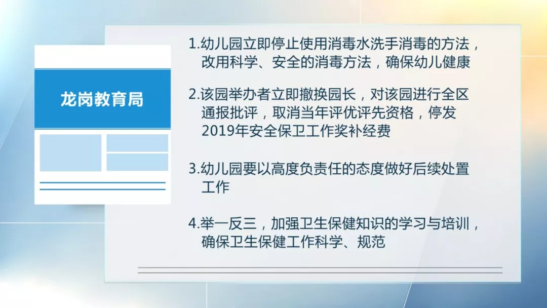 5月24日,龍崗區(qū)教育局了解到該情況后,立即派工作人員到幼兒園進行調查。經查,該園出現(xiàn)“皰疹性咽頰炎”后,違規(guī)使用強力消毒粉兌水給幼兒洗手消毒,存在衛(wèi)生保健上嚴重錯誤。