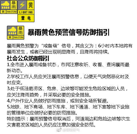 市民注意收聽、收看、查詢暴雨最新動(dòng)態(tài)。學(xué)校工作人員應(yīng)關(guān)注暴雨預(yù)警信息,以便天氣突然惡化時(shí)及時(shí)應(yīng)變。處于低洼易澇區(qū)、危房、邊坡等可能發(fā)生危險(xiǎn)區(qū)域的人員,應(yīng)關(guān)注降雨趨勢(shì),并采取必要的安全措施。戶外作業(yè)人員做好防雨措施,或到安全場(chǎng)所暫避。5.地鐵、地下商場(chǎng)、地下車庫(kù)、地下通道、地下室等地下設(shè)施的管理單位應(yīng)做好必要的防范措施。特別提示:暴雨預(yù)警信號(hào)取消后,河道周邊和危險(xiǎn)邊坡等次生災(zāi)害易發(fā)區(qū)域的人員仍應(yīng)注意加強(qiáng)安全防范。