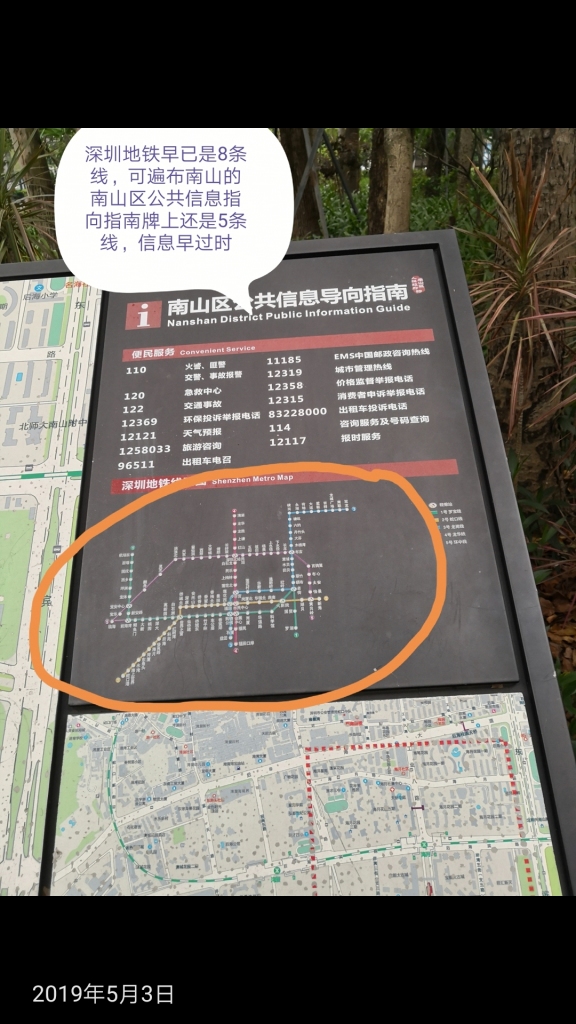 南山區(qū)“公共信息導(dǎo)向指南”指示牌中的地鐵路線信息嚴(yán)重滯后(網(wǎng)友供圖)↑