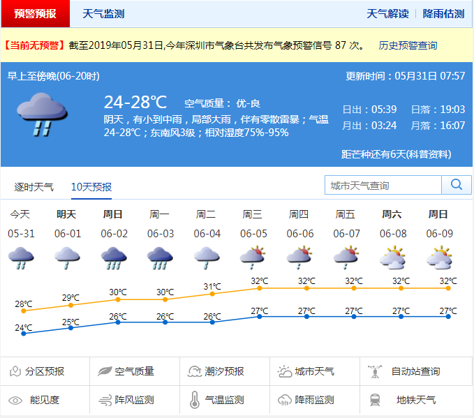 深圳新聞網2019年5月31日訊 記者從深圳市氣象局了解到目前我市仍處于龍舟水活躍期,31日至6月3日多局地暴雨。31日有中到大雨,局部暴雨;1日有陣雨,天氣轉趨悶熱,2-3日降雨再次加強,有大雨到暴雨,伴有雷暴;展望4-6日,仍多陣雨。