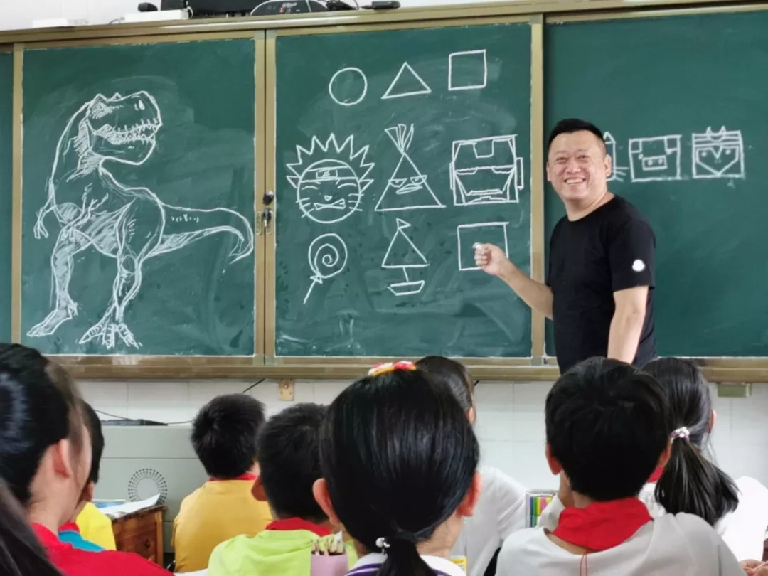 同學(xué)們?cè)谙旅娌碌脽峄鸪欤罾蠋焻s一言不發(fā),繼續(xù)涂涂畫畫,漸漸的圖像露出了真容,一只栩栩如生的大恐龍出現(xiàn)在黑板上,教室里的小家伙們發(fā)出一聲聲驚嘆:
