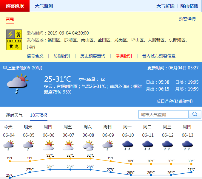 深圳新聞網(wǎng)2019年6月4日訊 近期深圳市(含深汕)頻繁強(qiáng)降雨過程4日起暫歇。6月4日氣溫25-31℃,多云,有短時陣雨;氣溫26-31℃;南風(fēng)2-3級;相對濕度75%-95%。