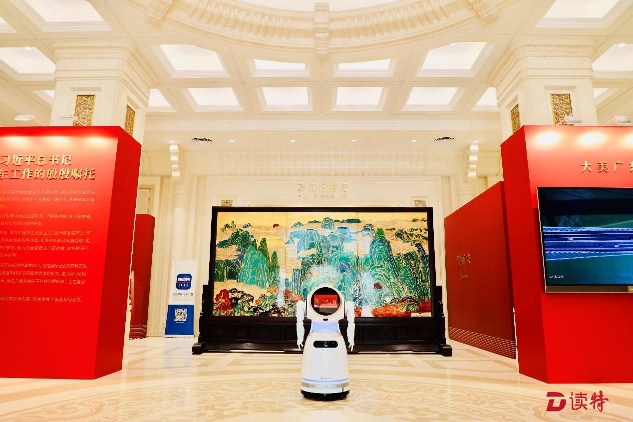 新中國(guó)成立70周年廣東省成果展入口處克魯澤提供智能迎賓服務(wù)。