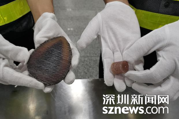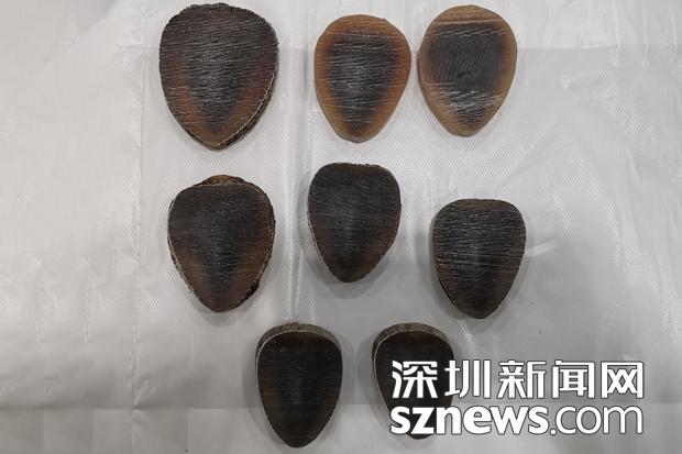 5月13日,一名30歲左右的男性旅客自福田口岸旅檢大廳入境,海關(guān)關(guān)員發(fā)現(xiàn)該男子行李不多,手里拎著一個塑料袋,神情有些緊張,有意躲避海關(guān)檢查,便將其列為挑查對象。經(jīng)檢查,關(guān)員在當事人攜帶的塑料袋內(nèi)查獲疑似犀牛角制品。