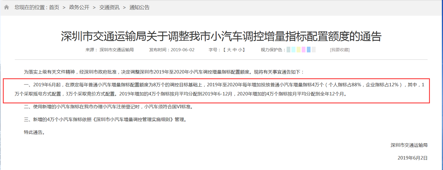 6月2日,深圳市交通運(yùn)輸局發(fā)布了關(guān)于調(diào)整我市小汽車(chē)調(diào)控增量指標(biāo)配置額度的通告