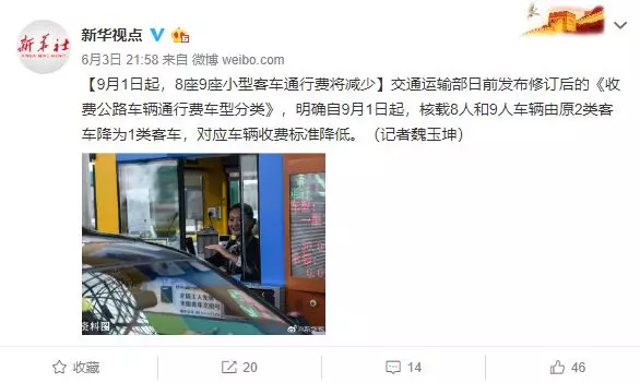 核載8人和9人車(chē)輛由原2類(lèi)客車(chē)降為1類(lèi)客車(chē),降低了對(duì)應(yīng)車(chē)輛的收費(fèi)標(biāo)準(zhǔn)