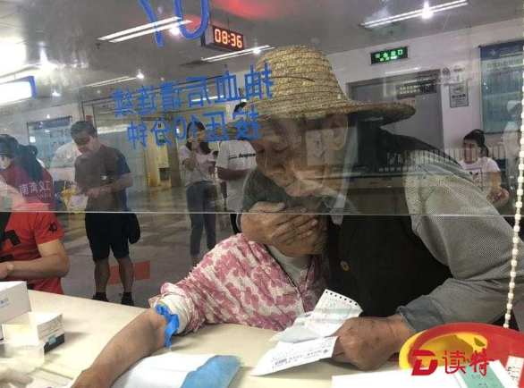 一名七旬老人陪老伴抽血檢查時,因為擔心其暈血,老人貼心地擁抱老伴,還捂住其眼睛不讓其看抽血。