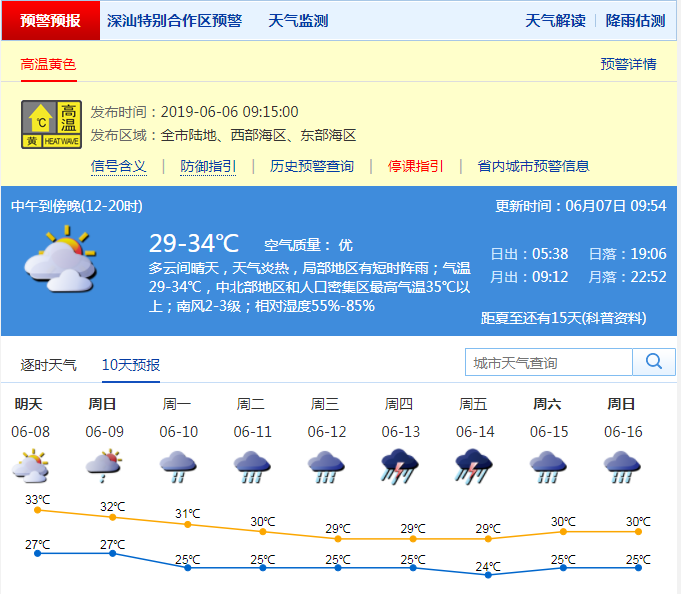 深圳新聞網(wǎng)2019年6月7日訊 記者從深圳市氣象局了解到,7日多云間晴,天氣炎熱,局地有短時陣雨;氣溫28-34℃,中北部地區(qū)和人口密集區(qū)最高溫度將達到35℃以上;南風2-3級;相對濕度75%-90%。7-8日晴天間多云,有局地短時(雷)陣雨,最高氣溫34℃,中北部和人口密集區(qū)35℃或以上;9日有雷陣雨,局部大雨;10日起進入新一輪龍舟水降雨集中期。