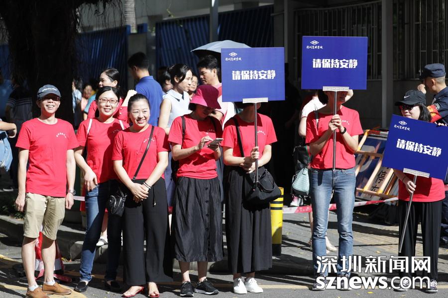 深圳實(shí)驗(yàn)中學(xué)老師等待在考點(diǎn)外,為學(xué)生發(fā)放準(zhǔn)考證