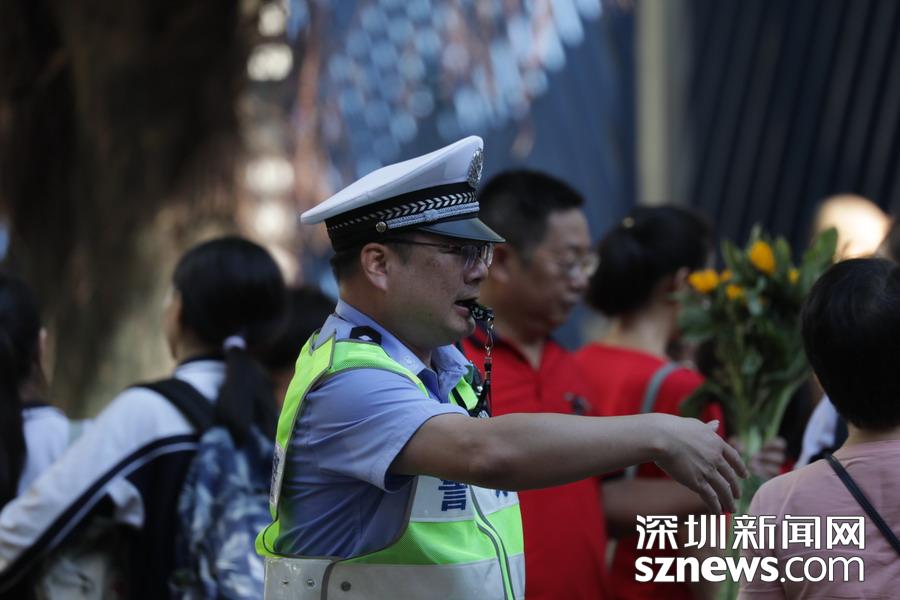深圳實(shí)驗(yàn)中學(xué)考點(diǎn)門口,一名交警正在指揮路面交通