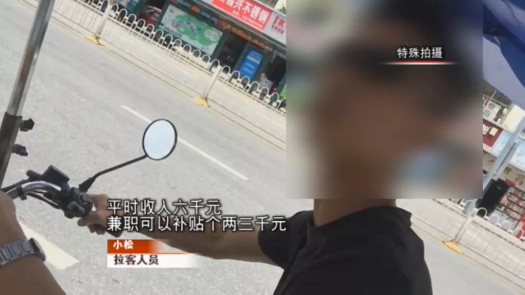 這些拉客人員年齡大多都在50歲左右,不過(guò)也有相對(duì)年輕的面孔,三十出頭的小松(化名)告訴記者他本身是某公司的專職司機(jī),為了補(bǔ)貼家用,每天下午下班后都會(huì)騎著電單車(chē)兼職來(lái)拉客。