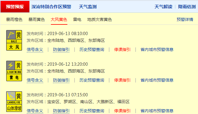 【深圳市地質(zhì)災(zāi)害氣象風(fēng)險(xiǎn)預(yù)警2019年第17號(hào)】根據(jù)目前降雨情況,結(jié)合我市地質(zhì)環(huán)境條件,現(xiàn)對(duì)全市陸地發(fā)布地質(zhì)災(zāi)害氣象風(fēng)險(xiǎn)黃色預(yù)警,氣象因素致上述地區(qū)發(fā)生地質(zhì)災(zāi)害的風(fēng)險(xiǎn)較高,請(qǐng)相關(guān)部門和單位做好地質(zhì)災(zāi)害各項(xiàng)防御工作。