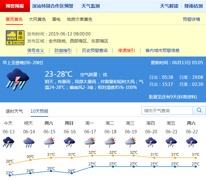 預(yù)計(jì)全市1-2小時(shí)內(nèi)將出現(xiàn)20-40毫米局部50毫米降水,深圳市氣象臺(tái)于2019年06月13日08時(shí)將暴雨黃色預(yù)警擴(kuò)展至全市,全市處于暴雨戒備狀態(tài),請(qǐng)注意防范。