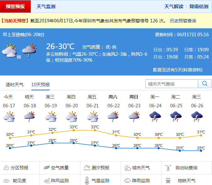 深圳新聞網(wǎng)2019年6月17日訊 深圳市氣象局預(yù)計(jì)17日白天有陣雨或雷陣雨,局部大雨;18日多云有短時陣雨或雷陣雨;19-20日多云間晴,局部地區(qū)有短時陣雨,天氣炎熱;21日多云有短時陣雨。22-24日,陰天,有陣雨或雷陣雨。