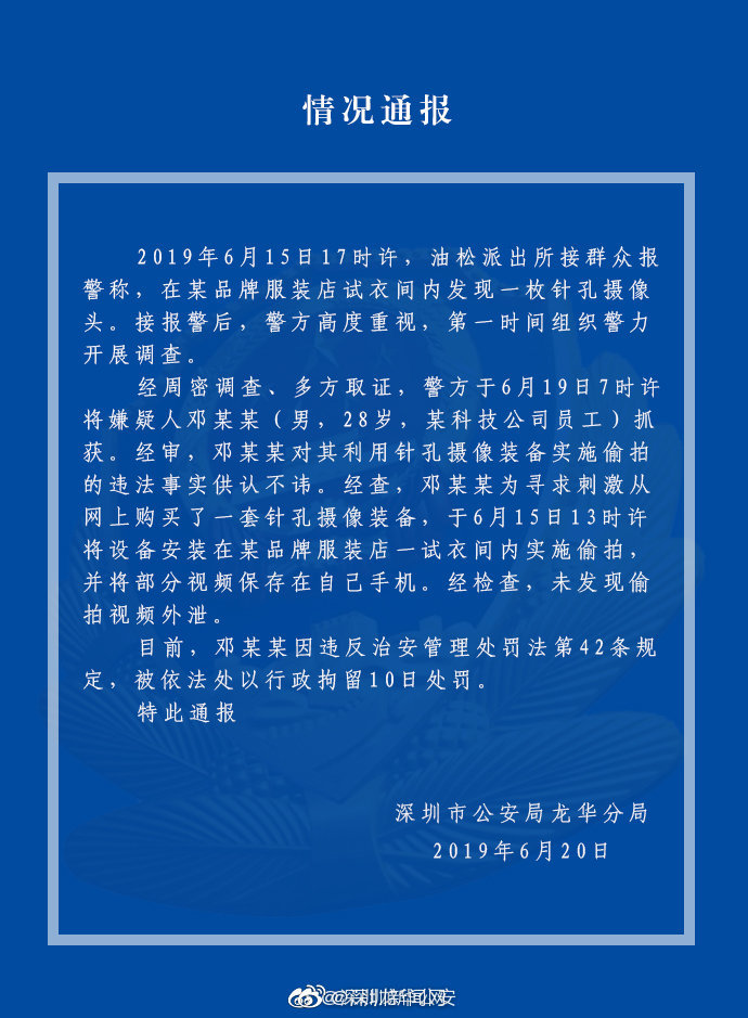6月19日,深圳市一家優(yōu)衣庫門店暗藏針孔攝像頭一事有了最新進(jìn)展。龍華警方表示,嫌疑人鄧某某(男,28歲)已被抓獲,其為某科技公司員工,為求刺激安裝,目前被依法處以行拘10日處罰,未發(fā)現(xiàn)視頻外泄。多地多起偷拍事件頻發(fā),證明這不是孤立的個案。想管住日漸泛濫的針孔攝像頭,不能僅靠公眾每次住宿時的“偵探式”自救和“地毯式”搜查,諸多應(yīng)對的方法也難逃人性與欲望的丑惡。涉事的優(yōu)衣庫門店在事發(fā)時曾表示,檢查試衣間只檢查是否有顧客遺留物品,而此前某涉事酒店負(fù)責(zé)人以攝像頭安裝隱蔽、工作人員難以發(fā)現(xiàn)、不專業(yè)為由,回避問題。店家事后的說辭讓人心生涼意,大事化小、小事化了的補(bǔ)救措施也不能消除消費者心中的恐懼,作為管理方尚且如此態(tài)度,作為弱勢群體的消費者,還需要多少案例才能換來隱私的保障?
