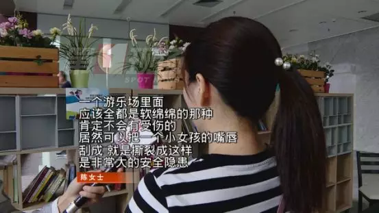 陳女士說(shuō),這個(gè)臺(tái)階原本是用一層軟軟的泡沫包裹,并用鎖扣固定的。這個(gè)鎖扣原本也應(yīng)該要包裹起來(lái),但不知為何卻裸露在外。陳女士的女兒這么一摔,正好磕在硬硬的鎖扣上,嘴巴被劃了一個(gè)口子。