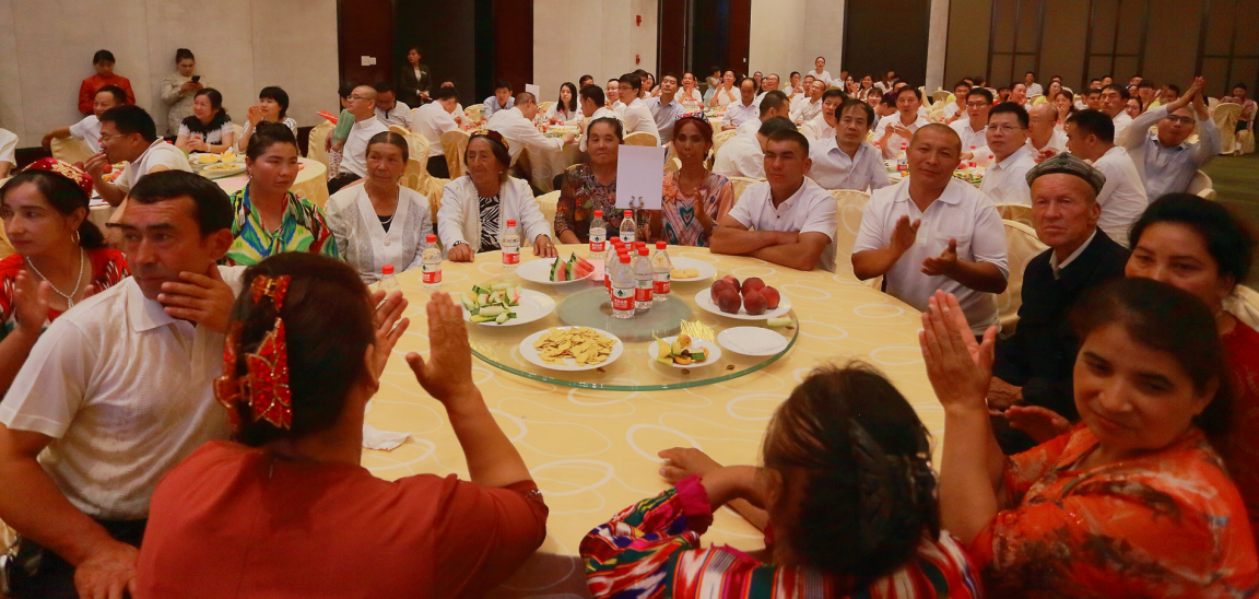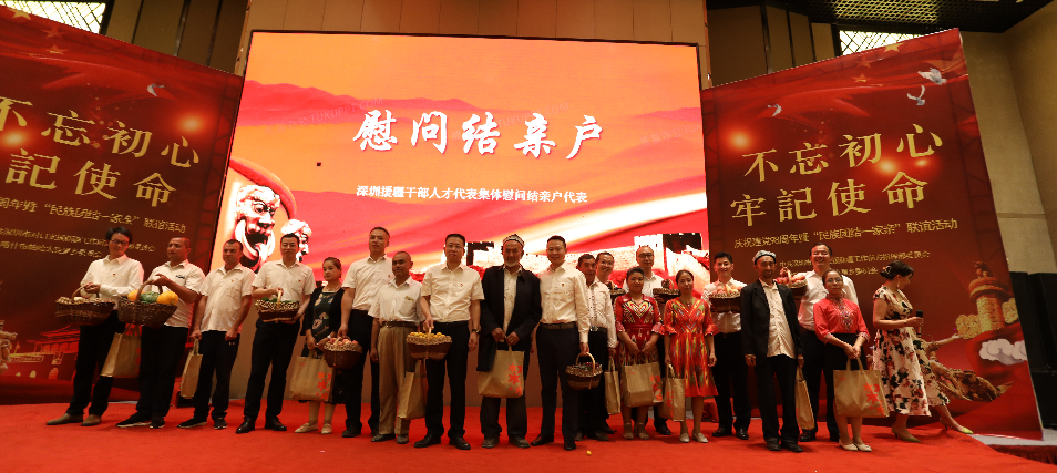 深圳援疆前方指揮部副總指揮袁富勇同志、黨委委員黃東、王漢偉同志和各處(室)、組、隊負責(zé)同志(代表)與帕鄉(xiāng)結(jié)親戶代表一同上臺,互贈禮物。