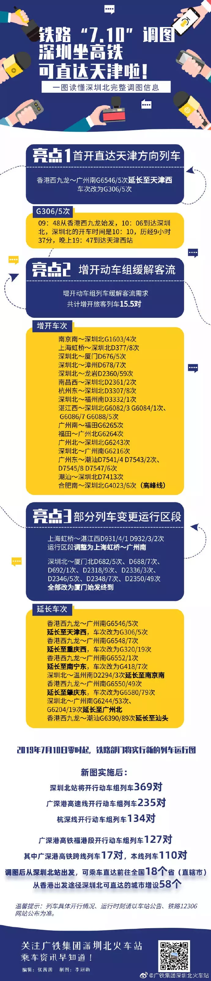 根據(jù)新的運行圖安排,深圳北站將開行動車組列車369對,廣深港高速線開行動車組列車235對;杭深線開行動車組列車134對?!?·10”調(diào)圖后,深圳北站首開前往天津方向列車,屆時從深圳北站出發(fā),可乘車直達(dá)前往全國18個?。ㄖ陛犑校粡南愀鄢霭l(fā)途徑深圳北可直達(dá)的城市增設(shè)58個。