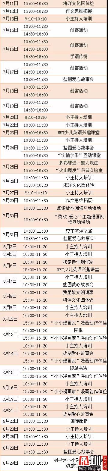 同時,7月13日—8月30日期間,區(qū)圖書館少兒館及沙頭角分館少兒服務(wù)區(qū)還適時延長了暑期服務(wù)時間,開放時間為每周一到周五的10:00—18:00,周末的09:00—18:00。來來來,鹽田的孩子們,玩樂之余也別忘記學習哦,到圖書館來趟書香之旅吧。
