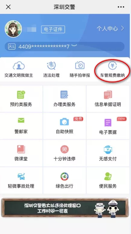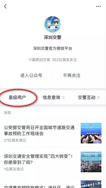 01 車主本人/代辦人關(guān)注【深圳交警】微信公眾號(hào),點(diǎn)擊進(jìn)入【星級(jí)用戶】,注冊(cè)登錄星級(jí)用戶后,在頁面選擇【車管規(guī)費(fèi)繳納】。